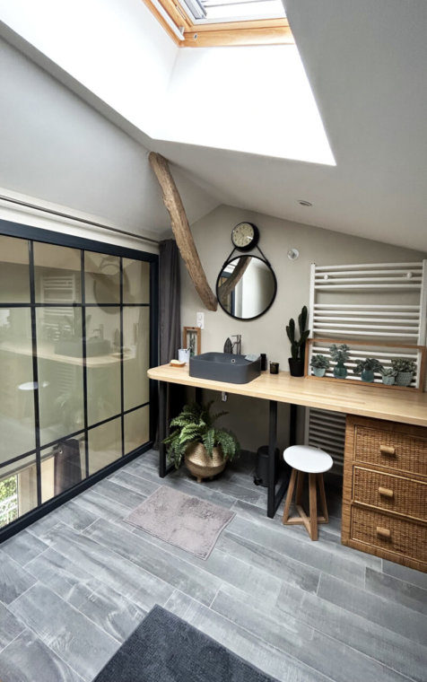 Dans cette jolie maison de village située non loin de la Roche de Solutré, on ne suspecte pas tous les espaces disponibles. Dans une ancienne remise, nous avons aménagé un espace couchage/chambre d’amis, conçu duplex avec un plancher bois technique et une diffusion de lumière optimale entre la salle de bains et le coin nuit. Nous y avons aussi rénové une salle de bains et les clients ont agrémenté le tout d’une belle décoration tout en douceur.